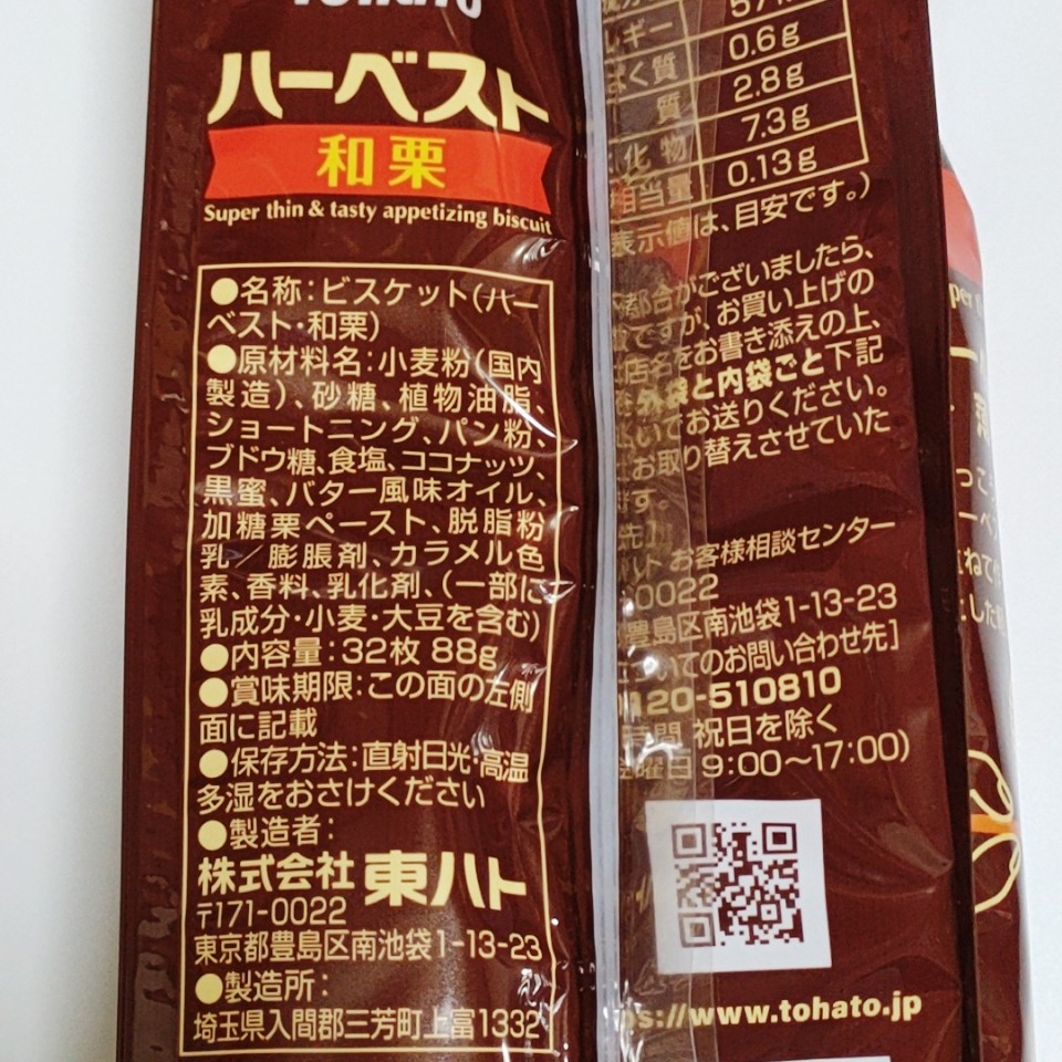 容量はいつもと同じく、ハーベスト4枚入りの個包装が8袋入り。サクッと食感で、甘くて美味しい~(*^^*)