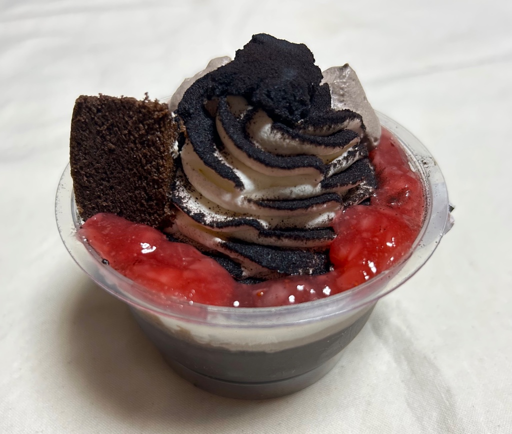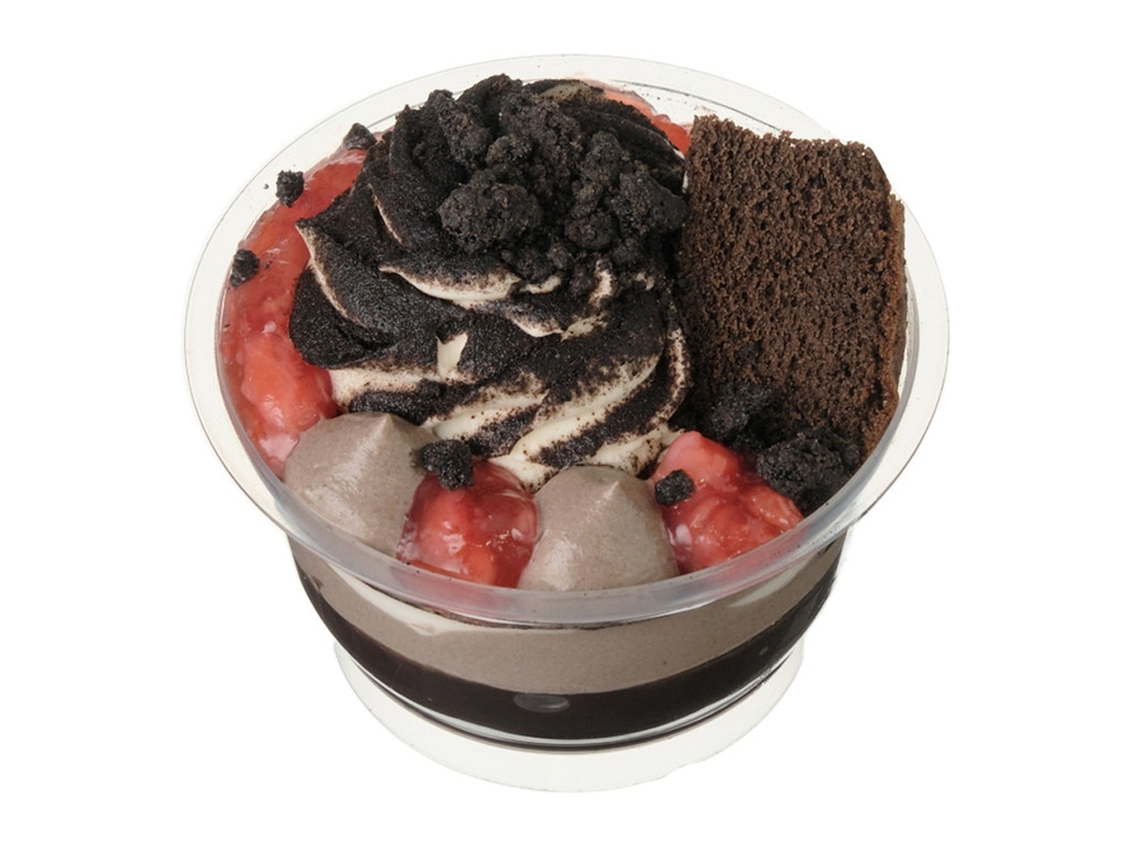ブラックココアの黒といちごの赤を組みわせたハロウィンらしいパフェ。いろいろな具材を盛り付け、食感も楽しめる仕立てです。