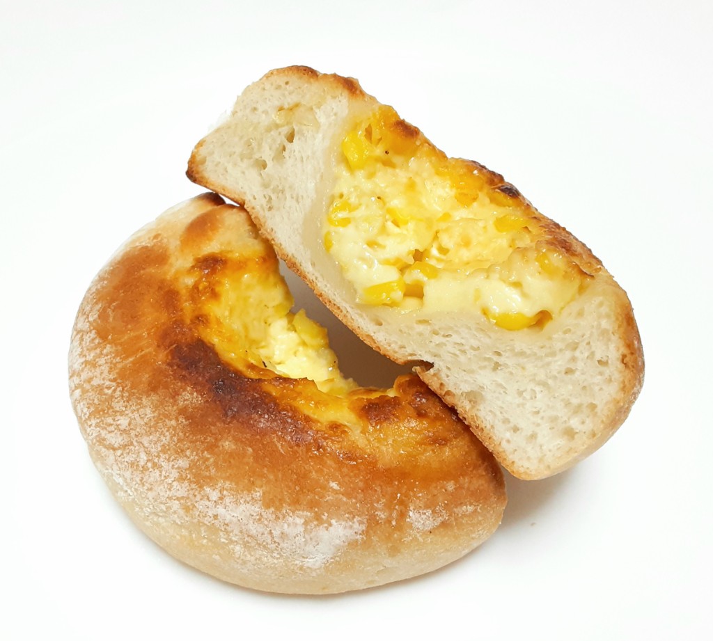 「ソフトなフランスパン生地の表面に醤油をうすく塗り、からし風味のコーンマヨネーズフィリングを絞り香ばしく焼き上げました。」