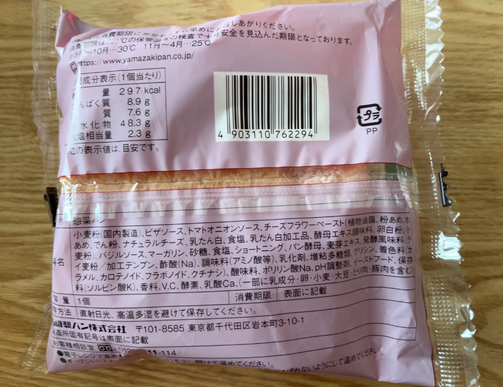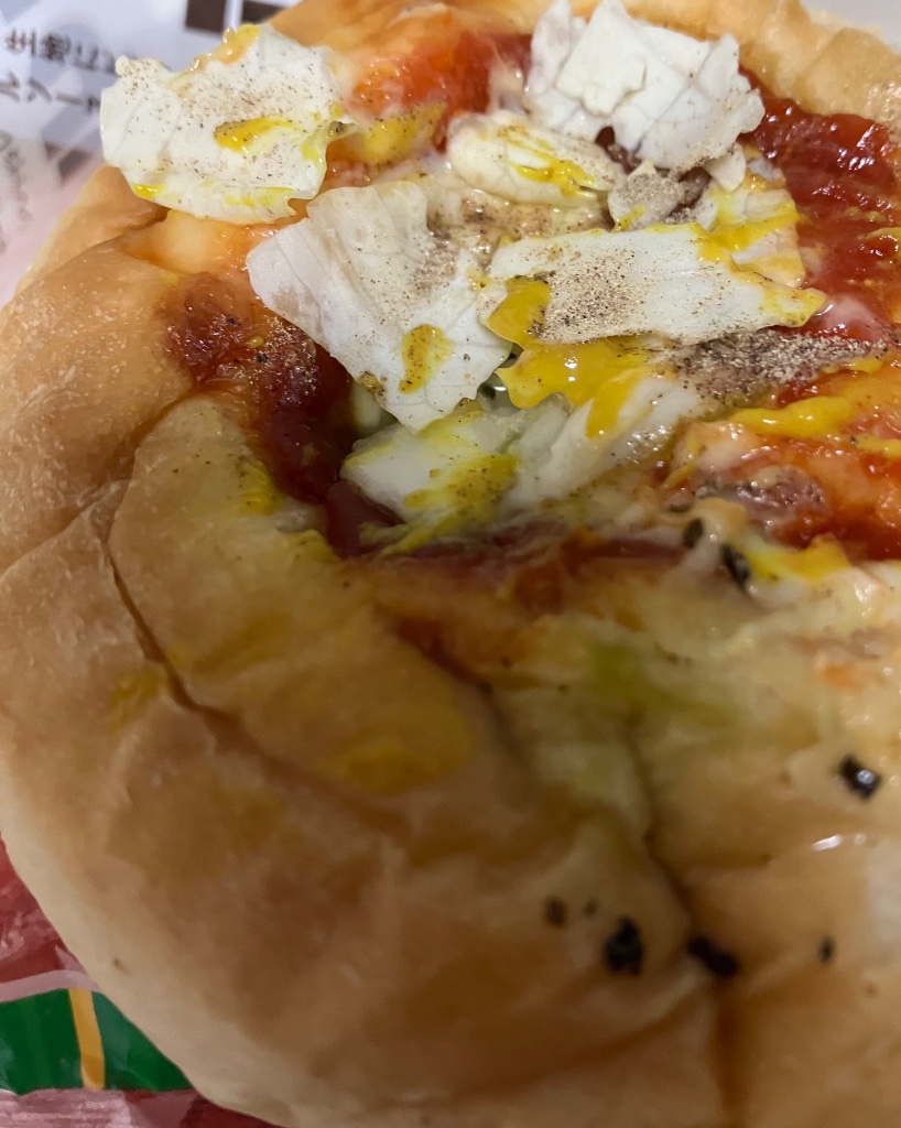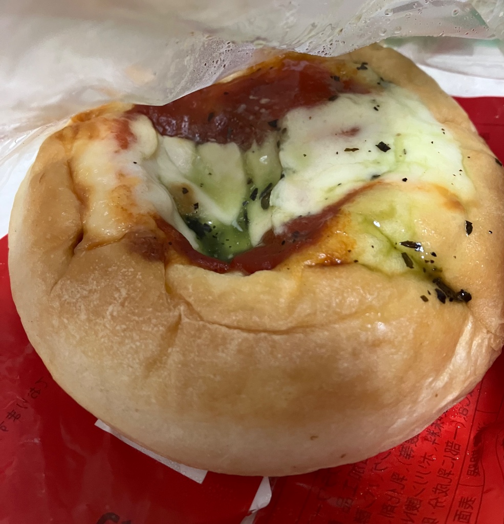 フランスパン生地は重さも食べ応えあり!袋込で114gくらいでした。味の濃いソースと合わせて食べると、しっかりピザを味わえます。