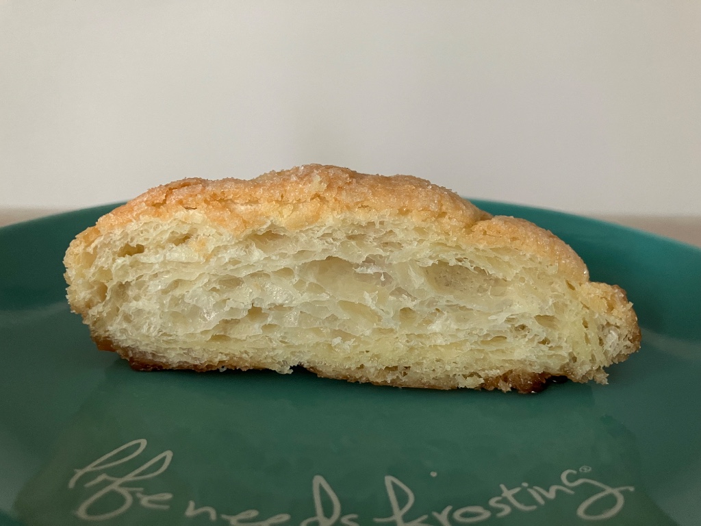 封から出すとがっちりと固く、食べる前からサクサク感が伝わってきます。しかし裏を返すと、クイニーアマンかな?と疑うくらいに、キャラメリゼが疎らで、控えめ。