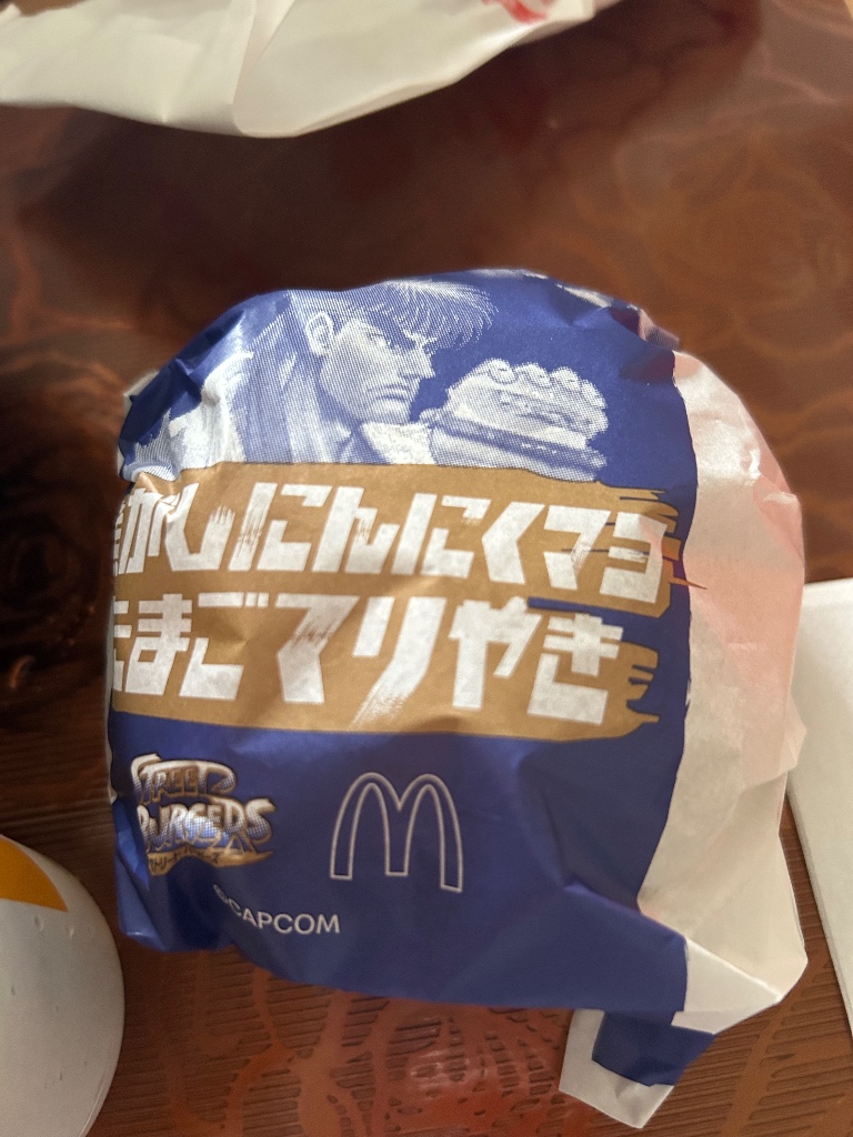 ストリートファイターとコラボした期間限定のハンバーガー。ニンニクの味が濃く、ブラックペッパーが効いてるのか辛かった。