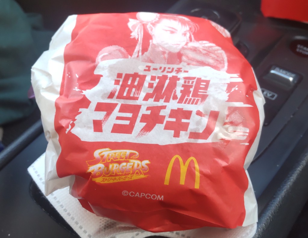 ストリートファイターとコラボした期間限定のハンバーガー。ザクザクの油淋鶏チキンとマヨの相性が良い。美味しかった!