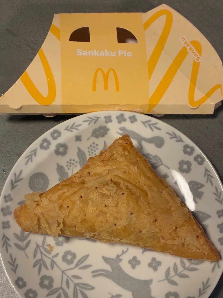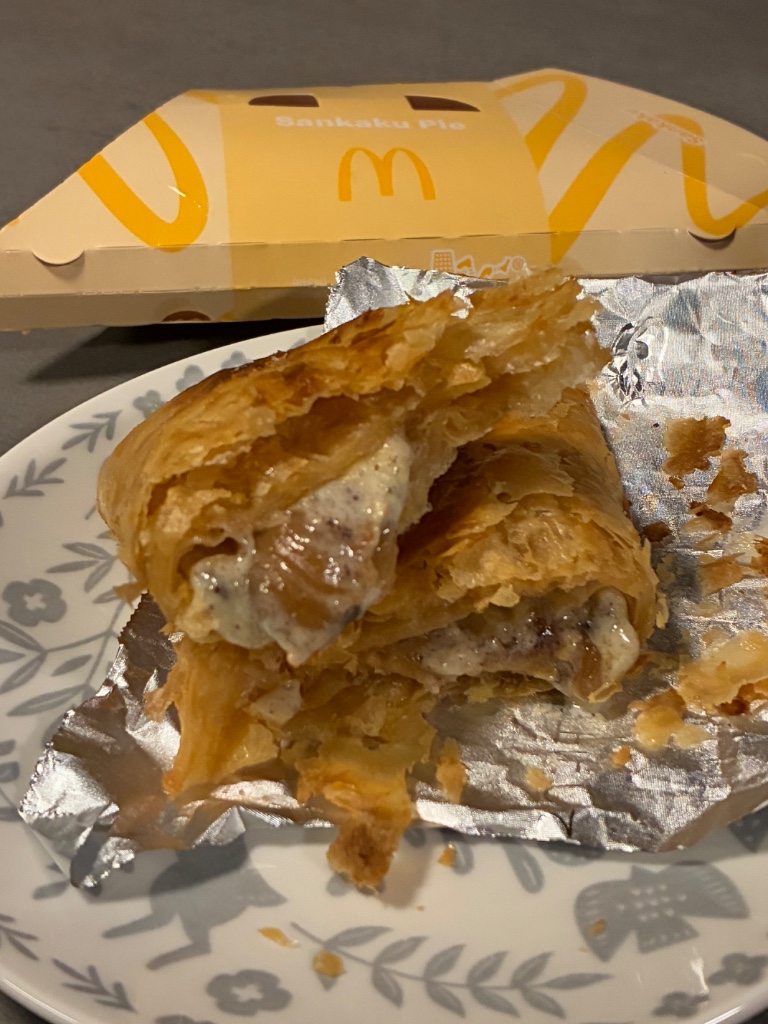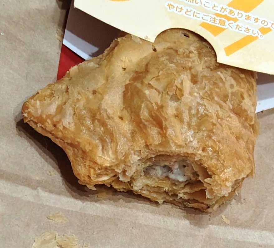 温かいスイーツ?っていうだけであまり前向きではなかったのですが、いただいたので、実食。なにこれ!めちゃくちゃ美味しいじゃない!甘くない、クリームが二層?かな?コーヒー風味しっかり、パイのサクサク残ってる!でした。一度三角チョコパイを食べてから甘すぎてマクドナルドから遠のいてましたが、何年かぶりのマクドのコチラは自分でも機会があれば購入したいと思いました。