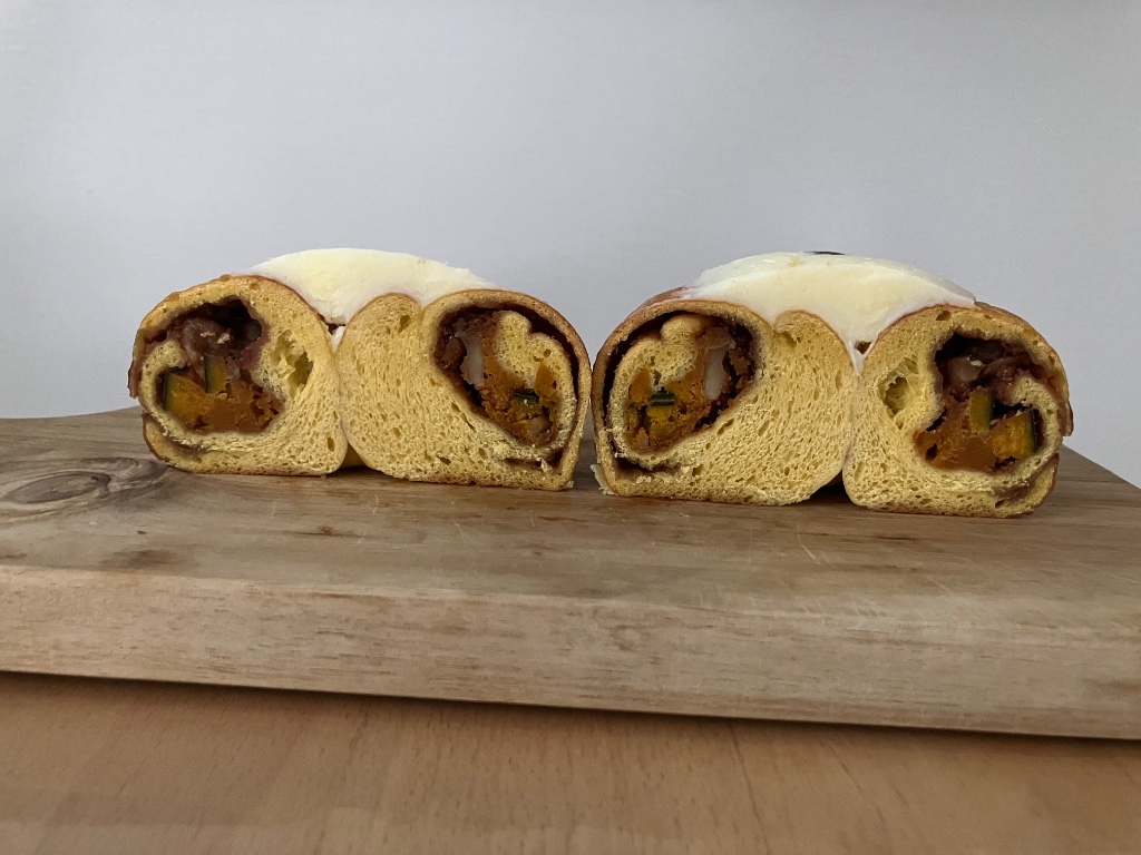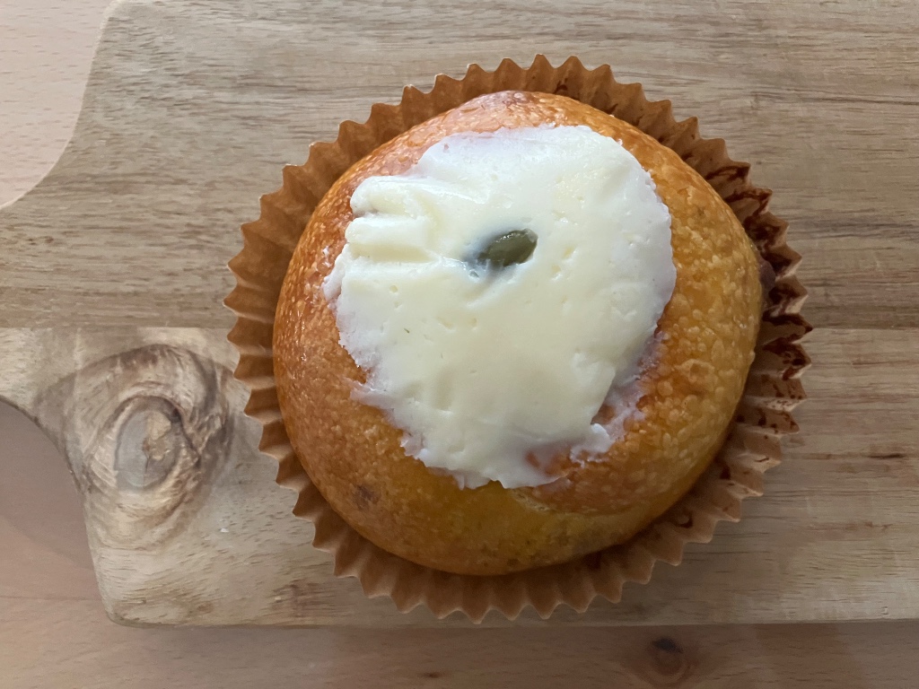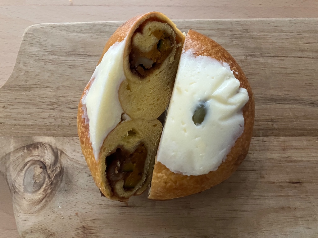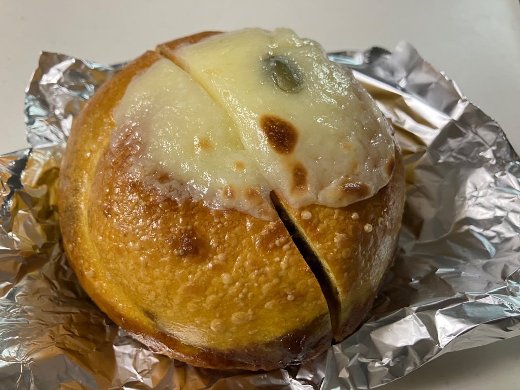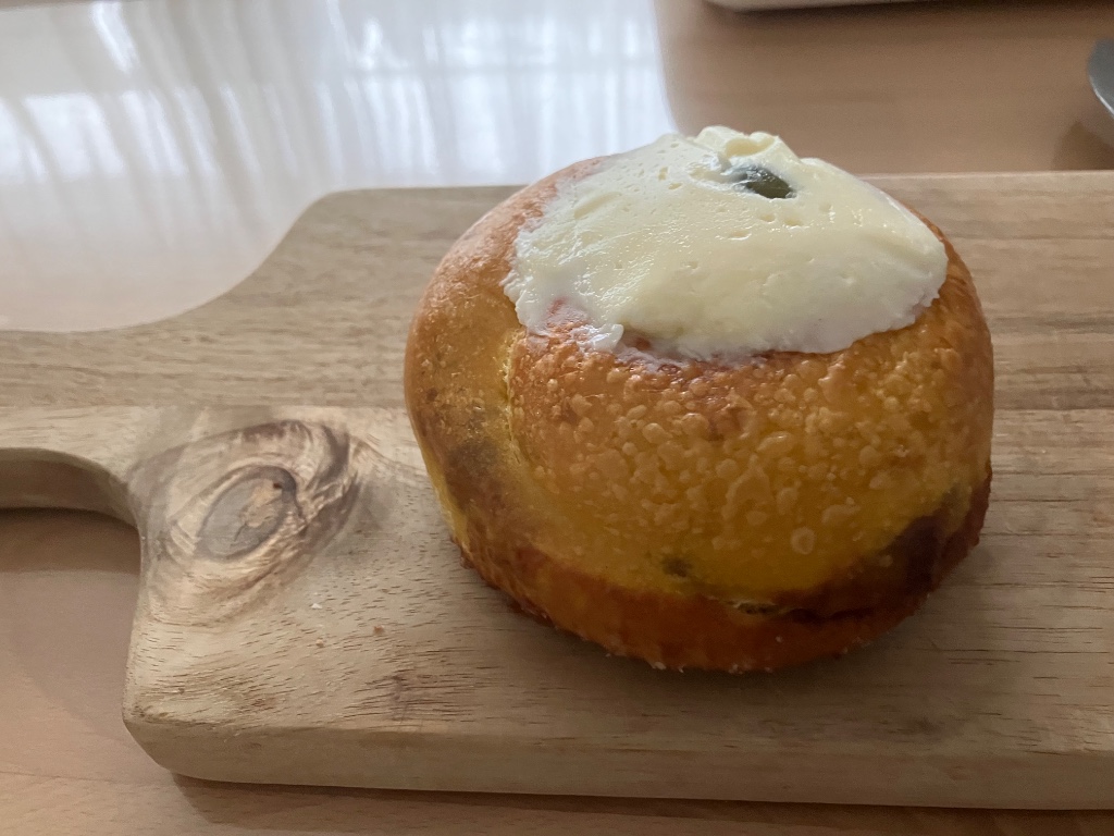 パンプキンシナモンシュガー フロスティングクリーム 178g 茅ヶ崎市の人気ベーグル専門店 まるなかベーグルさんの催事購入品 こちらは 南瓜生地に南瓜と胡桃 シナモンシュガーを巻き込み フロスティングクリームをトッピングしたもの ぐるぐるタイプの巻き込みで 断面はシナモンロールそのもの 側面から飛び出すシナモンが愛しい◎ リベイクするとシナモンのいい香り クラストはむぎっとヒキのある感じ クラムはふかむぎゅ しっかり食べ応えがあり…続きを読む