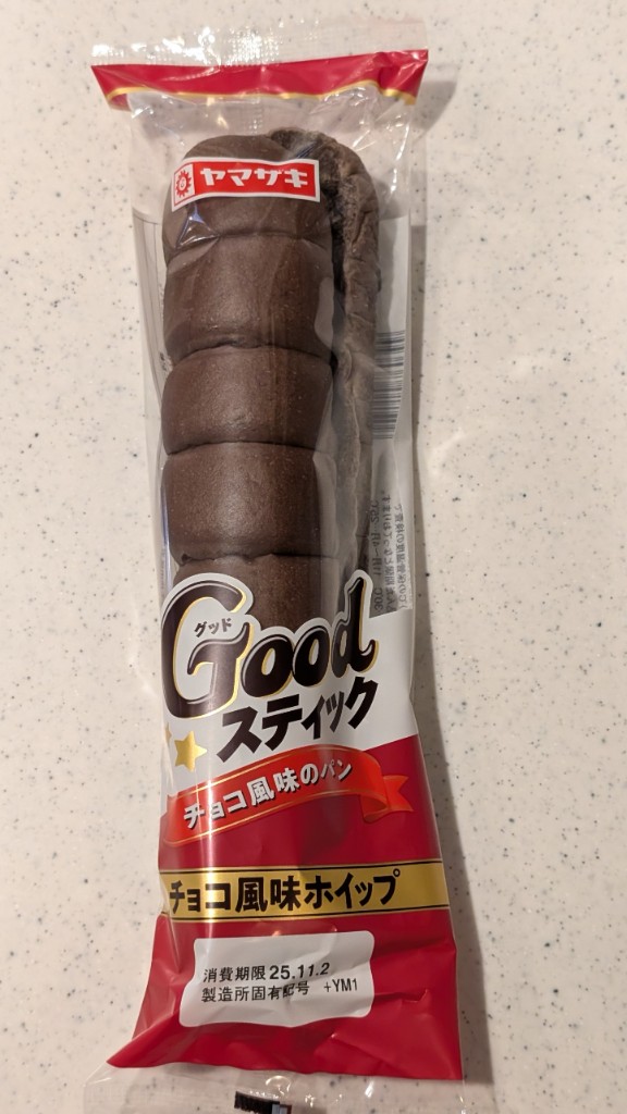 今回は山崎製パンさんの グッドスティック チョコ風味ホイップを入手してみました チョコ風味のパン生地の中に チョコ風味のホイップクリームが サンドされています 生地とクリームの両方にチョコ風味を 使用したチョコ尽くしの一品 パン生地はビターな味わいですが クリームの方はチョコ寄りではなく ホイップクリーム寄りなので もう少しチョコ感があったら 良かったなと感じました #山崎製パン #菓子パン
