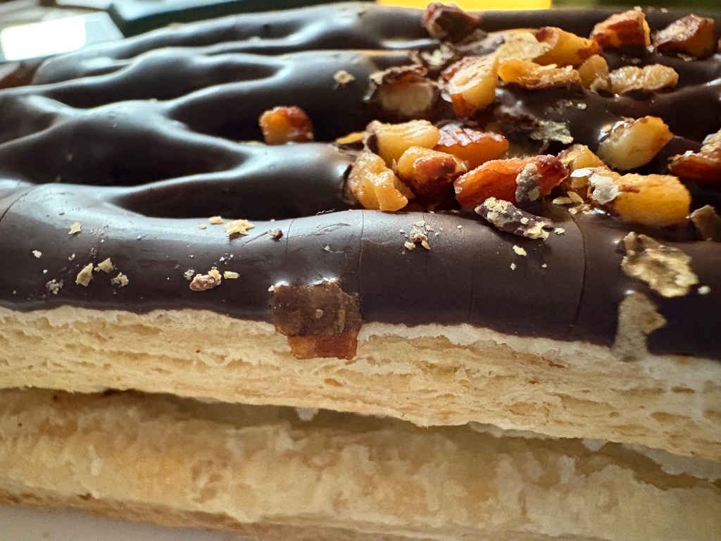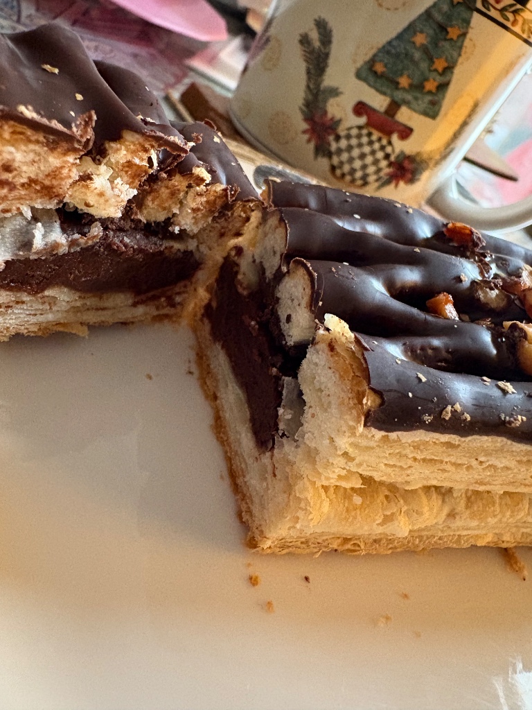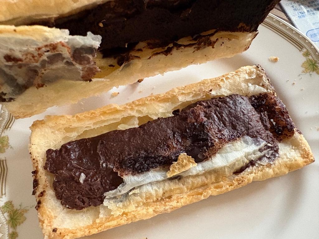 トップとパイ生地の間にビターチョコがかかっており、中間にはねっとり甘ーいチョコクリームがたっぷり(๑˃̵ᴗ˂̵)‼︎