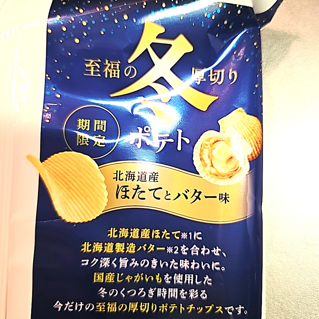 夏ポテトの冬バージョンって感じかな。ギザギザの厚切りポテチにほたてとバターの味。ほたてよりバターの味が強かった。美味しかった! #ポテトチップス #期間限定 ... 続きを読む