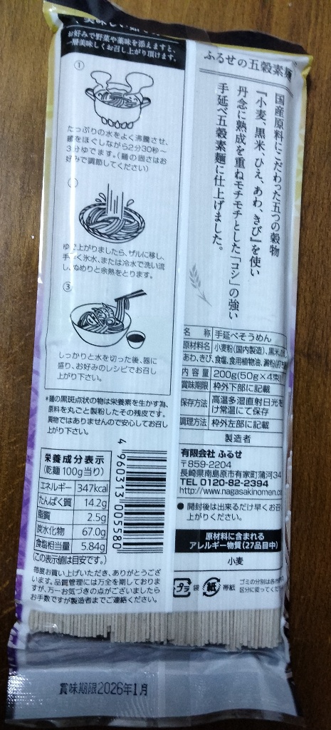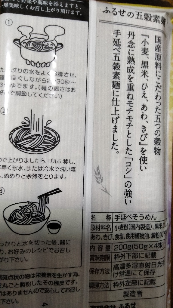 国産原料に拘り生協みたい…小麦、黒米ひえ、あわ、きび…モチ²とコシの強い五穀素麺…素麺は細い方がGrade高いと聴くけれどスーパーでは買えない色帯の三輪素麺にはあるのかな?細いからコシと言えど讃岐うどんや太いつけ麺、さのめん製富士宮焼そばのコシに勝てる筈はないわよ…