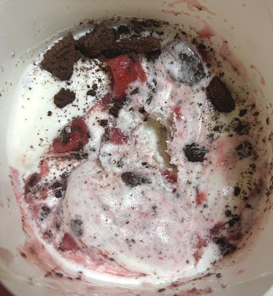 苺の果肉がゴロゴロ入ってて甘酸っぱくていちごミルクのアイスの中にクッキーがおるなって感じで