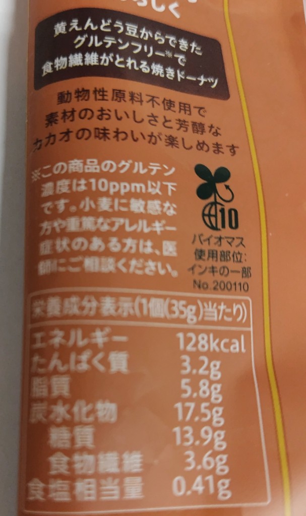 黄えんどう豆からできたグルテンフリーで食物繊維がとれる焼きドーナツ カカオニブが噛みごたえよく、甘さ控えめ ドーナツって感じの味ではないかな #冬の新作