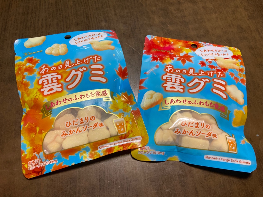 オレンジ色の雲の形をしていて、形は5種類ある。甘いみかん味で美味しかった。以前食べた雪グミより美味しい。レア型に鳥の形があるらしいが自分の買った袋には入ってなかった。