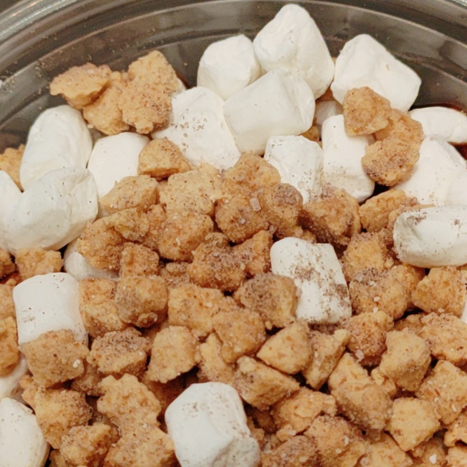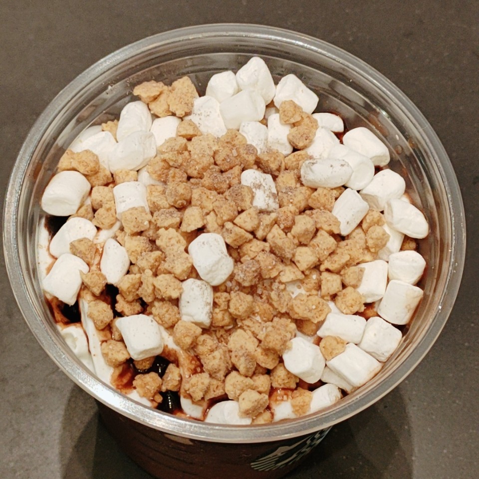 ホイップクリームの上にはスモア用ソース、マシュマロ、全粒粉入りのクランチをトッピングし、ブリュレシュガーで仕上げました。