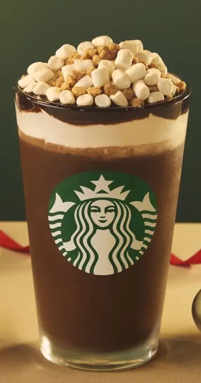 『チョコレートソースの中にエスプレッソを加えることで、香ばしさの中にビターな風味が際立つ、スターバックスならではの奥深い味わいです。ホイップクリームの上にはスモア用ソース、マシュマロ、全粒粉入りのクランチをトッピングし、ブリュレシュガーで仕上げました。ふわっとしたマシュマロ、さくさくとしたクランチの多彩な食感とともに、フラペチーノならではのワクワク感が広がる、ホリデーシーズンにぴったりの一杯です。』