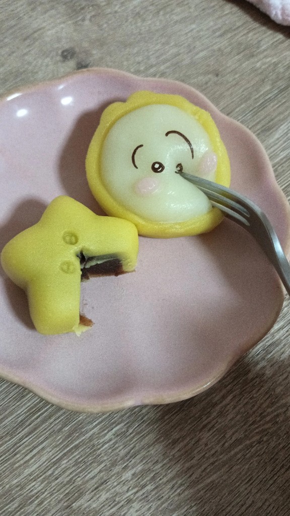 星から食う。外側の黄色は味ない。フォークを入れた感じは普通に練り切りなのに、チョコレート餡が完全に薬の味。これもっとどうにかなったでしょ。私は食えるけど、人によっては吐き出すレベルでは。