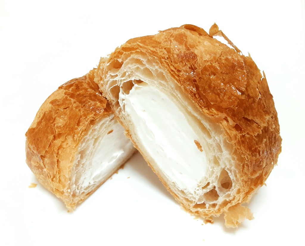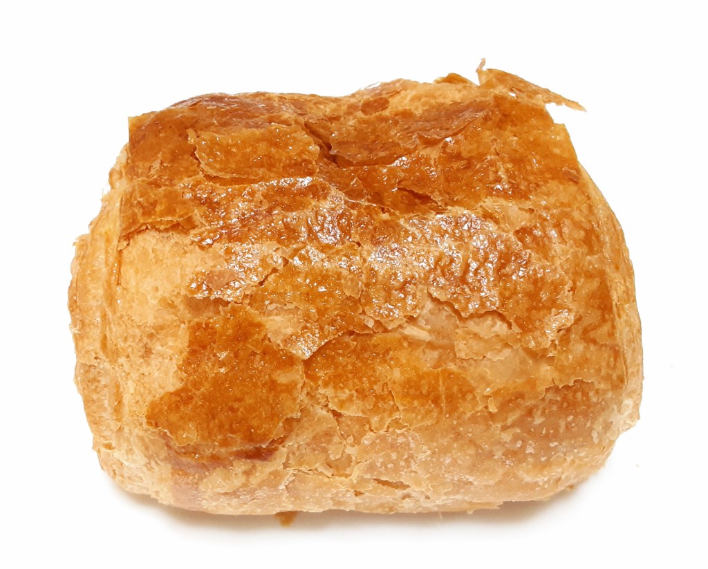 生地は想像通り、半透明な層部分に潜在的油脂分を多分に感じながらもシナッとした食感。やや酸味とそういうにおいの有る、常温販売のクロワッサンやデニッシュ相当です。予想より、焼いて劇的に美味しくならない生地でした。