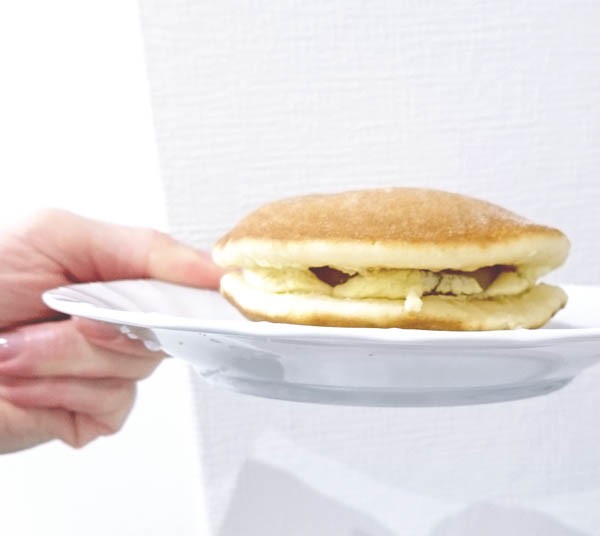 「あんころもち」というにはあまりにもころっとしていないお餅とホイップクリームがサンドされた、とても大きいどら焼きです。