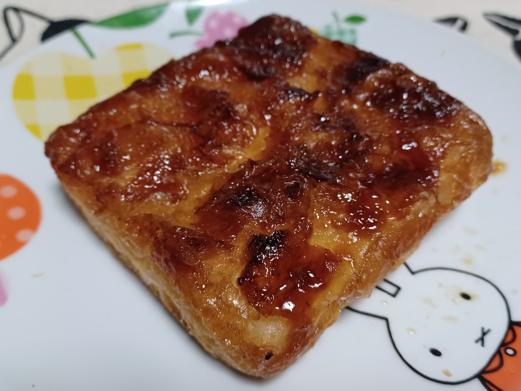 キャラメリゼされた表面のザクザクした食感とデニッシュ生地のじゅわっとした食感が心地よく、カスタードホイップが全体の甘さを和らげてくれるので、どんどん食べ進んでしまいました
