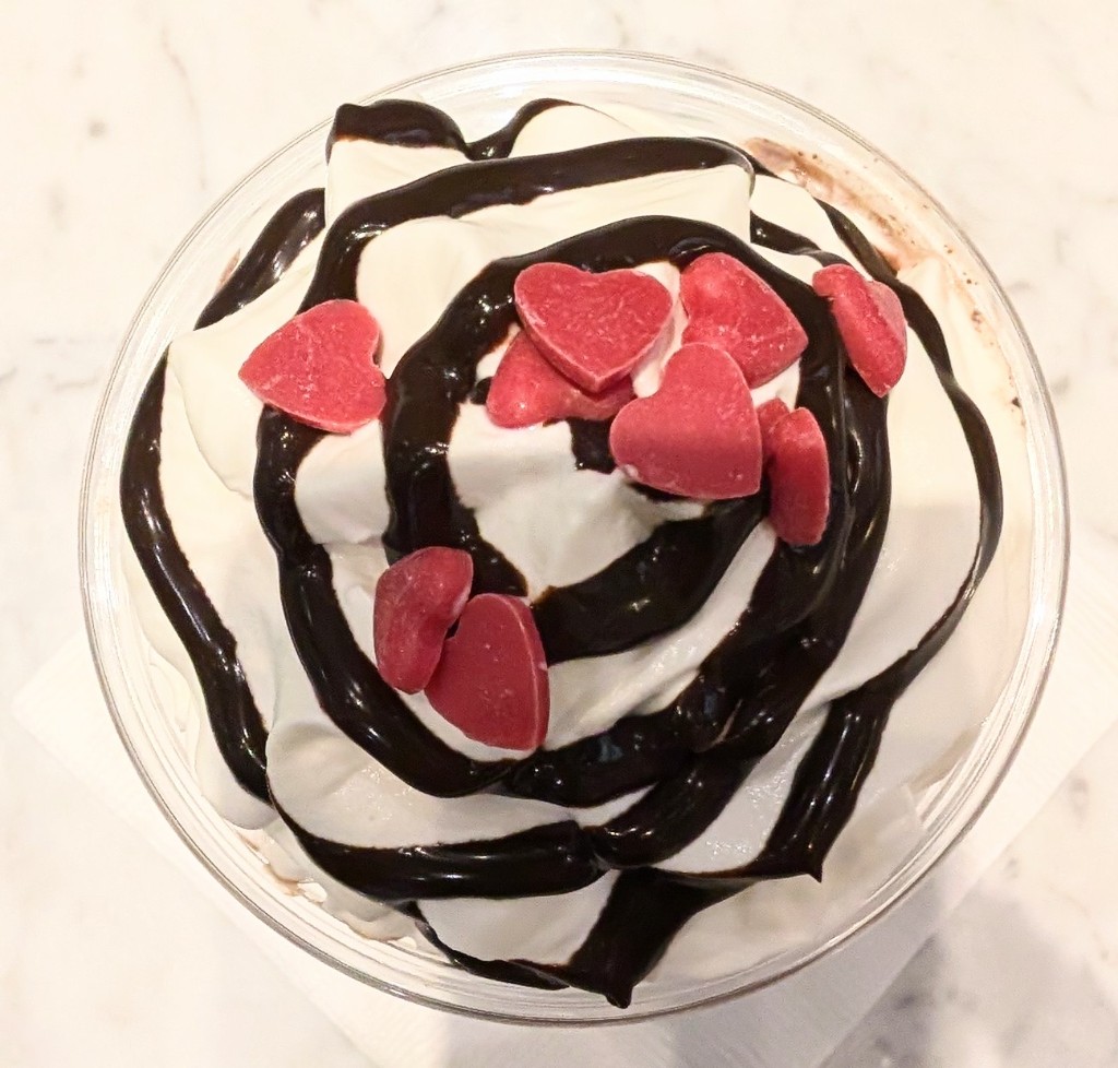 なめらかな生チョコソースを使用した、リッチな味わいのショコリキサーです。 ホイップクリームと生チョコソース、そしてバレンタイン気分を盛り上げる、可愛らしい赤いハートのチョコレートをトッピング。 口に含んだ瞬間、深みのあるカカオの香りとともに、濃厚なコクが広がります。甘く幸せな気分を運ぶ、心ときめく一杯に仕上げました。 とのこと🍀 830円(税込) 365kcal ハートチョコチップは カリカリ✨️ 甘めのミルクチョコの味わい?…続きを読む