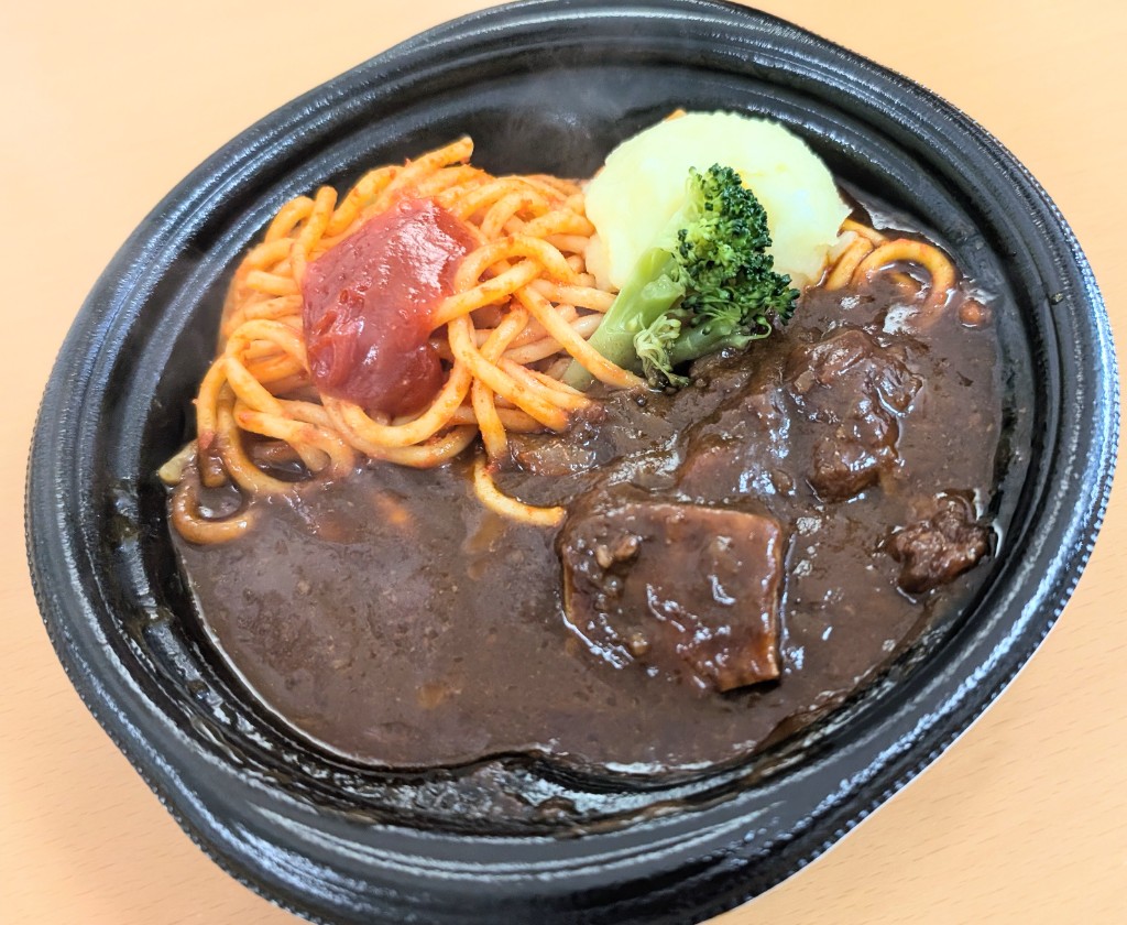 味はどれも想像通りの安定した美味しい味で、ビーフシチューは味噌入ってるからか味濃いめ塩気強めでマッシュポテトとの相性良かった お肉もほろほろで美味しかったけど、大きいものが1個しか入っていなかったのでもっとゴロゴロ入ってて欲しかったな💭 パスタはケチャップソース多め、味濃いめのナポリタンでビーフシチューと同じ量入っててボリューム感あった