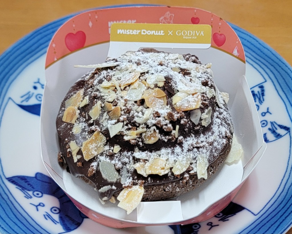 ゴディバとコラボした期間限定商品。ショコラドーナツ生地にガナッシュクリームとプラリネホイップを重ね、チョコをコーティング。ローストアーモンドとチョコクランチをトッピングしてます。