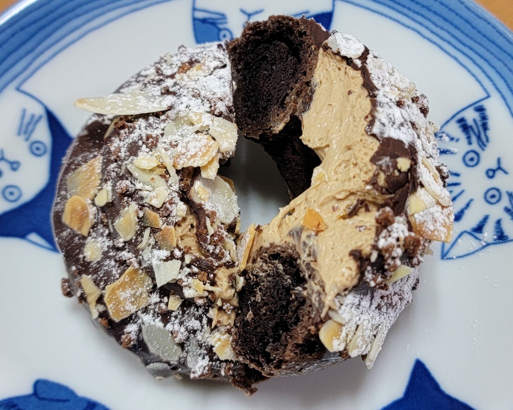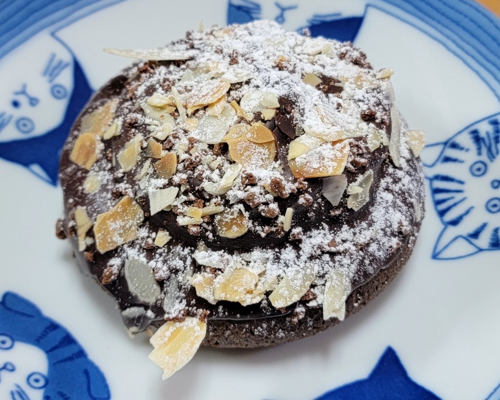 トリュフショコラドーナツプラリネ。スライスアーモンドとパウダーシュガーが綺麗です。