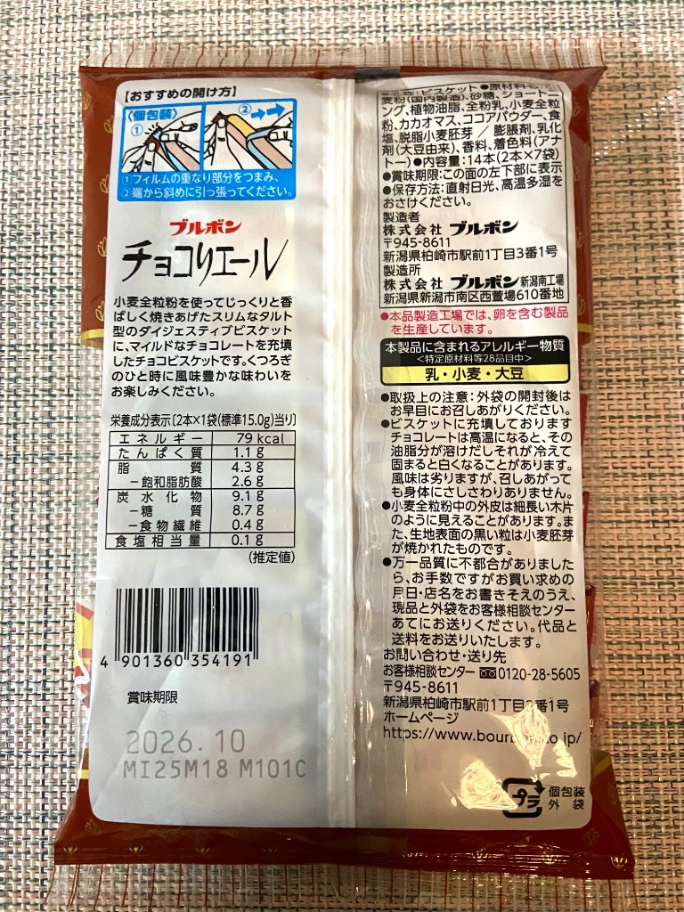 第一印象…うまっ! 胚芽のクッキーの塩味とチョコのバランスが◎! でも…なんか違う? えーとっ…。チョコが昔はもっと硬かったような…。 今はちょっとねっとり。 例えれば、ソントンのチョコスプレッドのような感じ。
