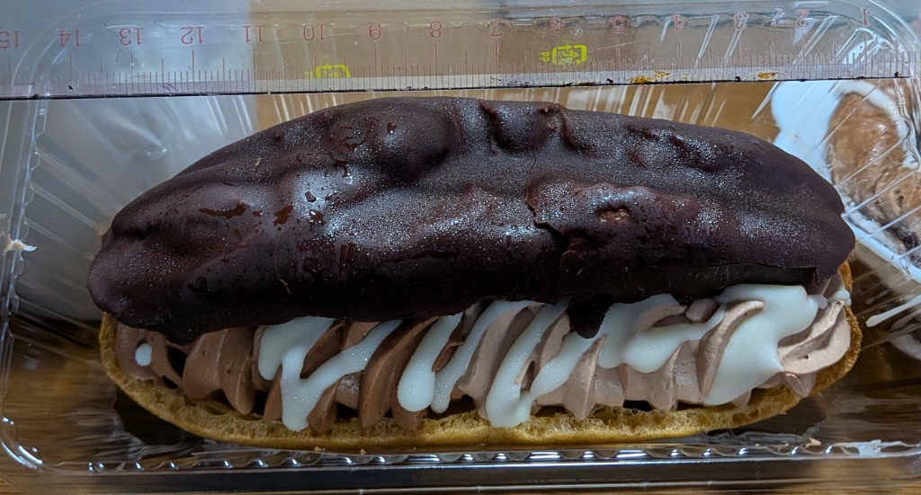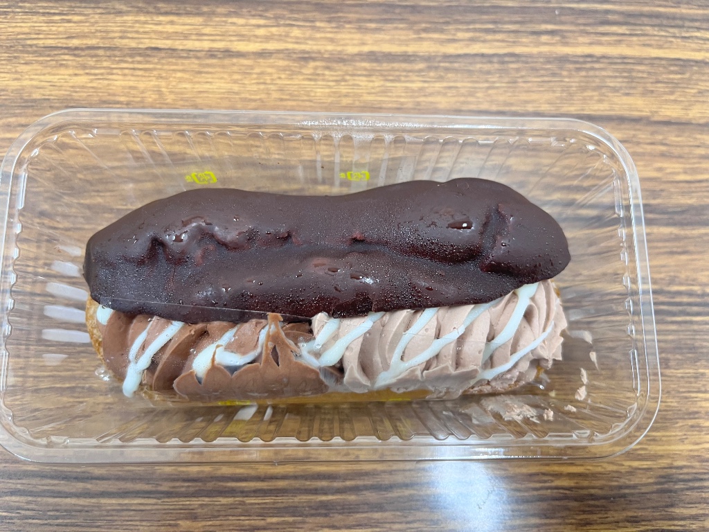 帰宅して早々食べました。一口頬張ると、まずエクレア生地のちょいしゅわ感と下のコーチングチョコのポリっと感がやってくる。チョコクリーム側から食べると上のコーチングチョコの味を感じるほどチョコクリームの存在感は薄めです。ホワイトコーチングは添え物?ダークチョコクリームは苦味があり、好みが分かれそうだなと思いました(私はこの苦味は少し苦手な部類でした)。
