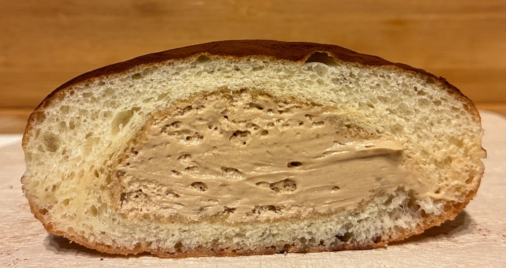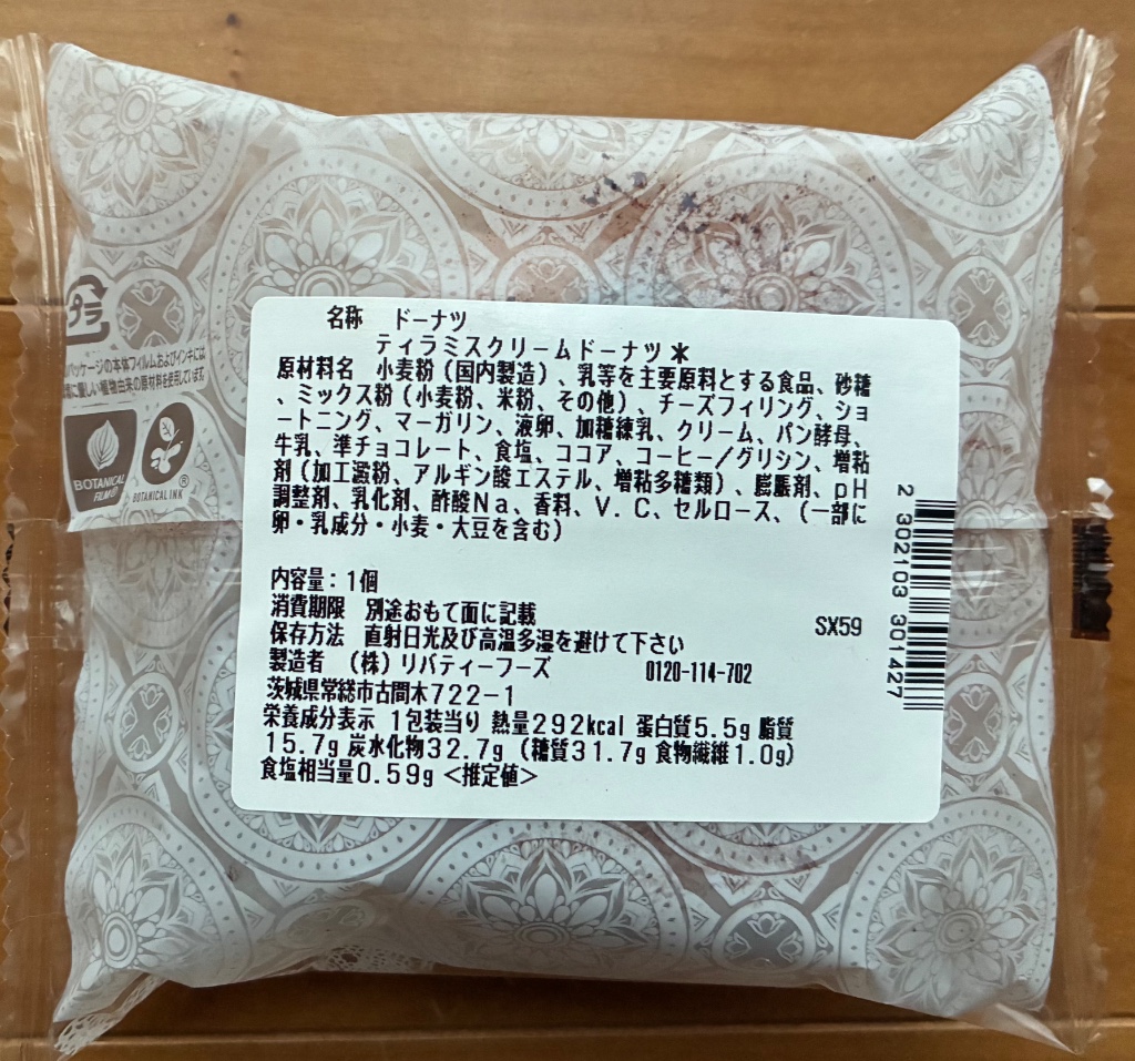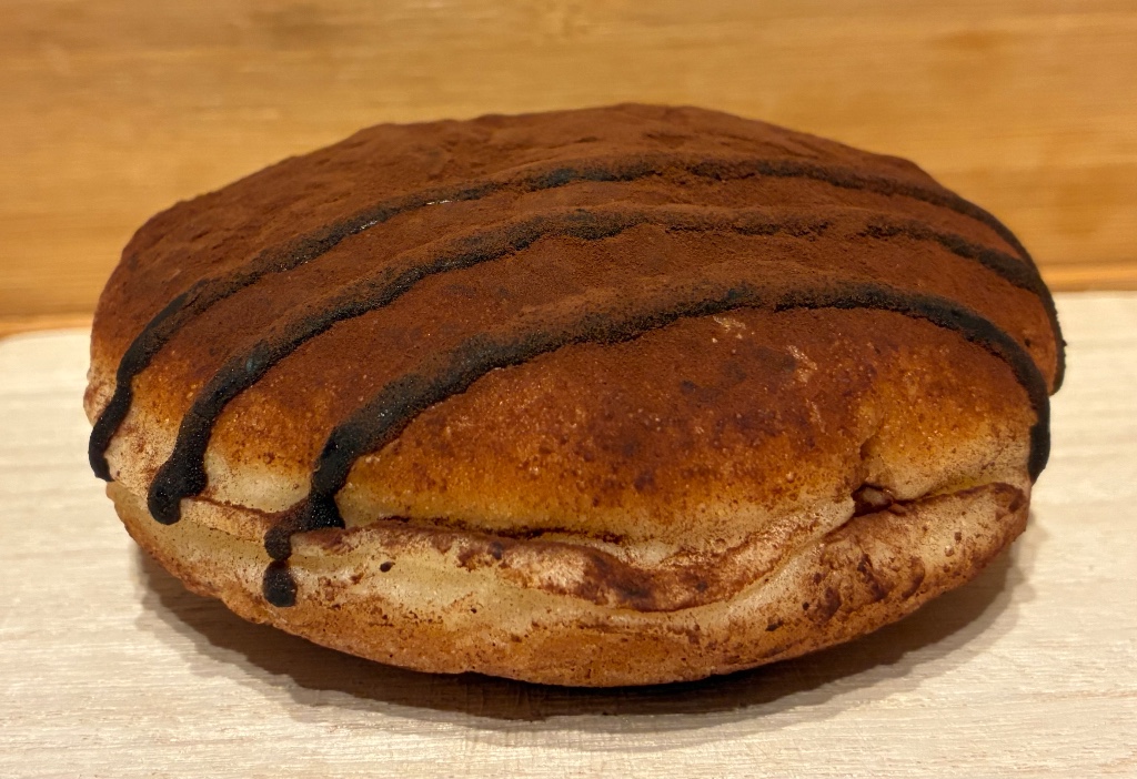 特にふわりともしっとりともしていないイーストドーナツ生地の中に、想像通りの(お菓子で感じる香料っぽい風味は無い)ティラミスクリーム。生地表面の線が割れて剥がれ掛かっていました。