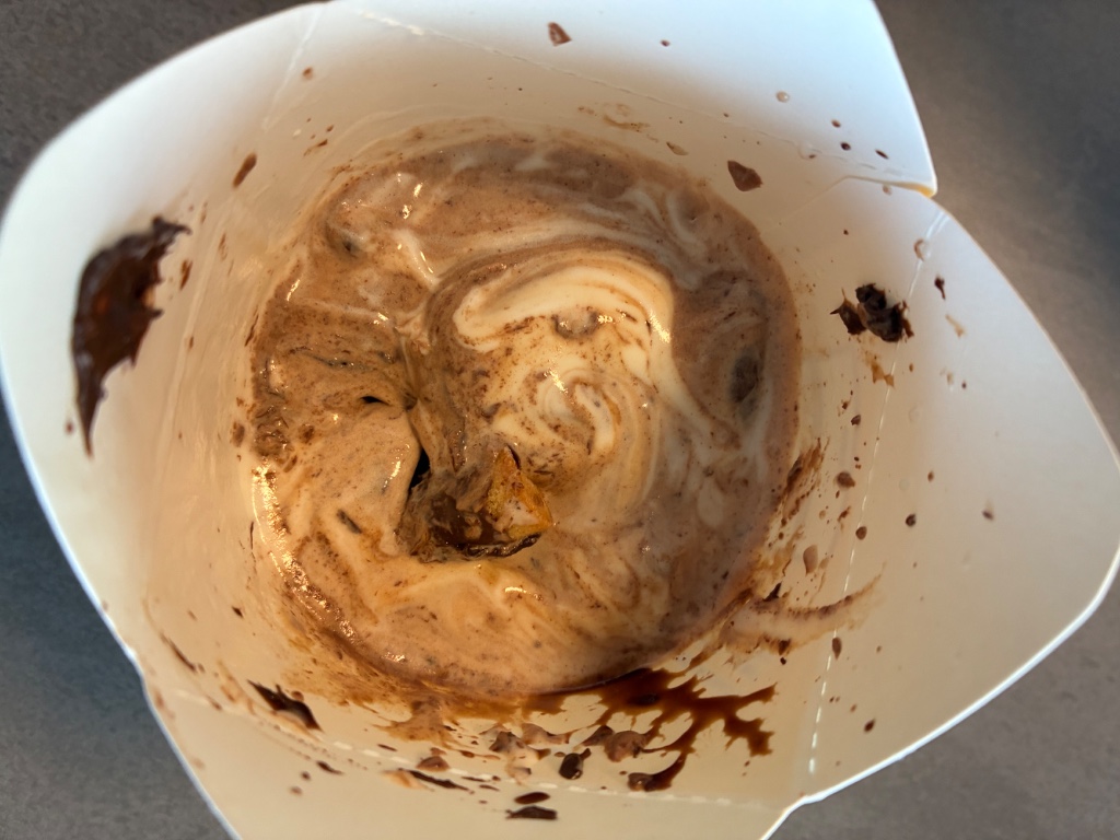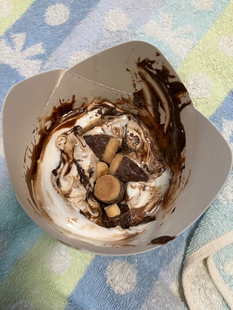チョコソースが混ざったソフトクリームでしかないので、前評判に騙された感あります。昔のキットカットが砕いて入ってたマックフルーリーが懐かしい。