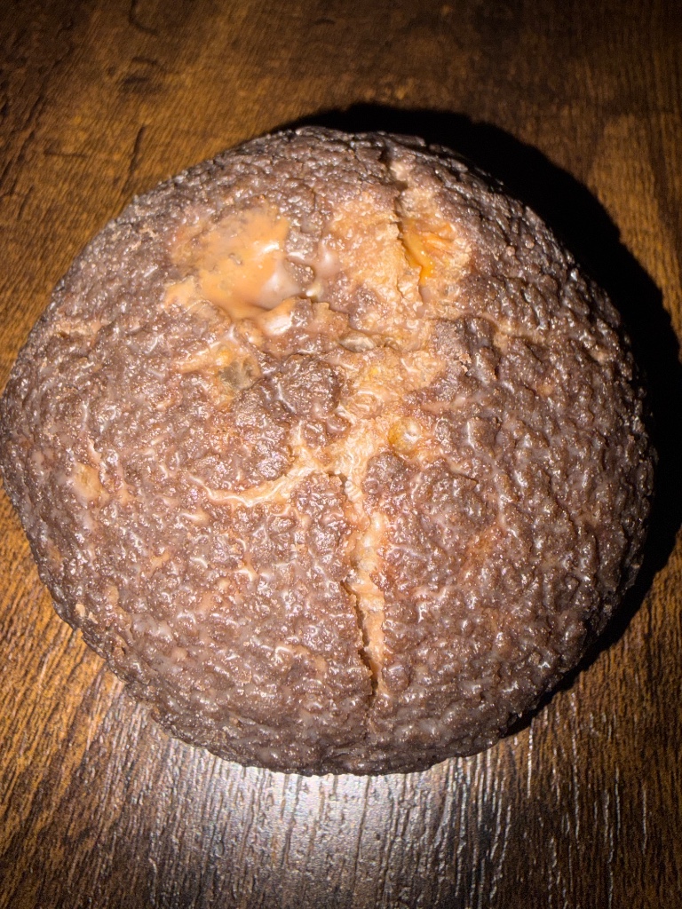 シュー生地はふかっとくしゅっと、表面のクッキー生地がサクサクとしていて、甘さ控えめでほんのりほろ苦いココア風味の香ばしい生地🤭内側にチョココーティングされているようで、パキパキと良い食感👍