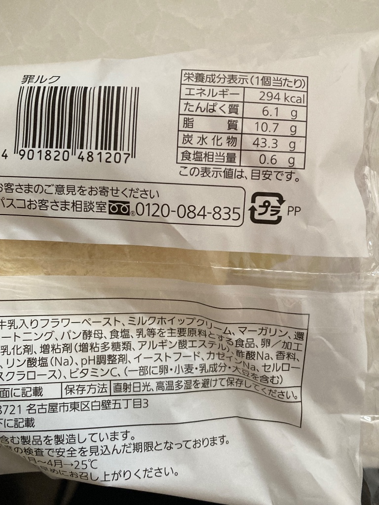 インパクトのある「罪ルク」という名前に釣られて購入。ふんわりした白いパンの中に、北海道産牛乳入りのクリームとミルクホイップクリームが入ってます。中のクリームは優しい甘さ。美味しかった!