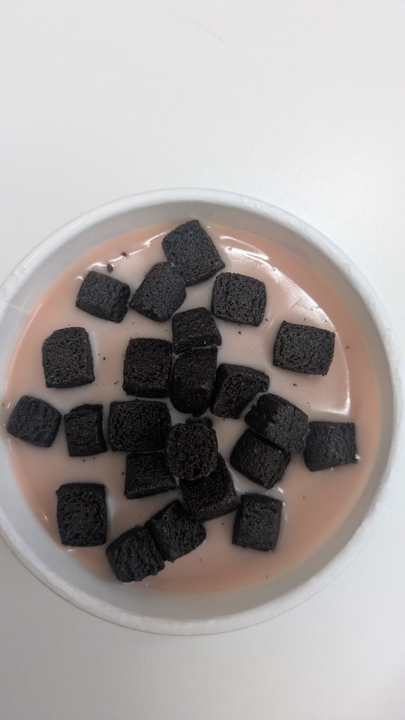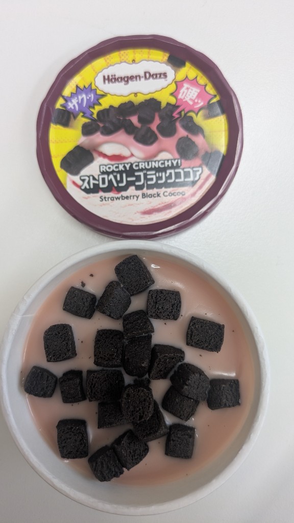 ダッツらしい濃厚な味わいのストロベリーアイスクリームの上に、ポッキーのいちごみたいな味のいちごチョコソースと、ザクゴリ食感のココアクッキー。クッキー&クリームに入っているしっとりした不均一形状破片とは違って、クルトンサイズのcubic形状で均等にトッピングされていました。浮いてる手前並みの硬い乾燥した食感・・・この点は毎度見事だと感じます。