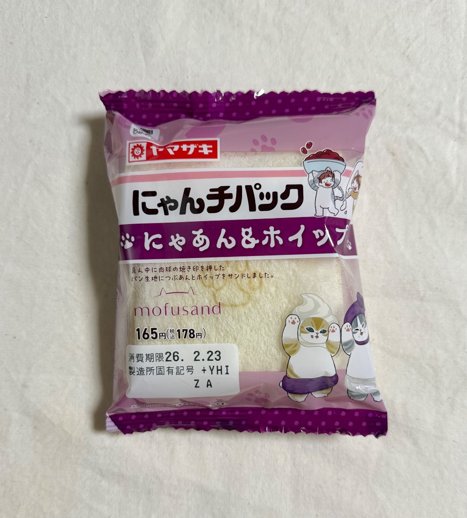 肉球の焼き印を入れたパンにつぶあんとホイップをサンドしたランチパックです。パッケージは「mofusand」とコラボレーションしたデザインで、全2種類です。