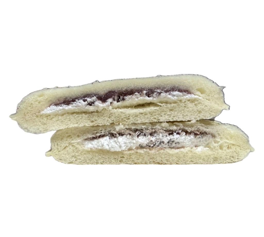 肉球の焼き印を入れたパンにつぶあんとホイップをサンドしたランチパックです。