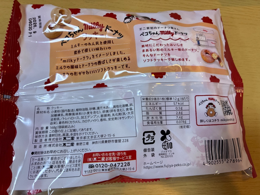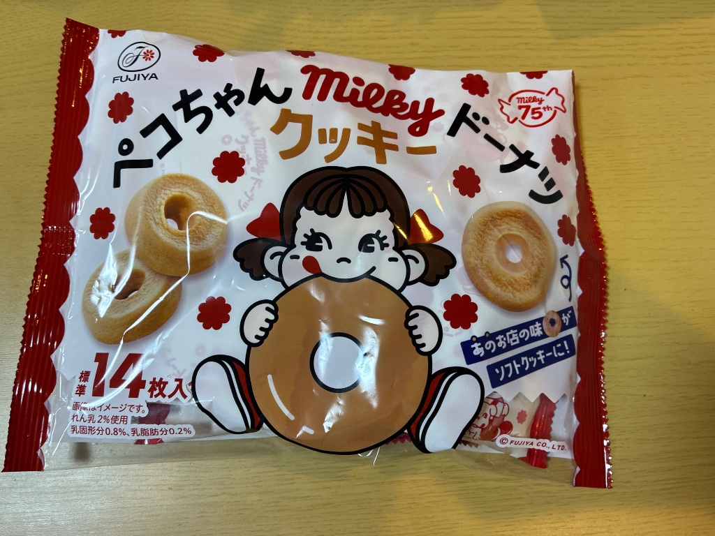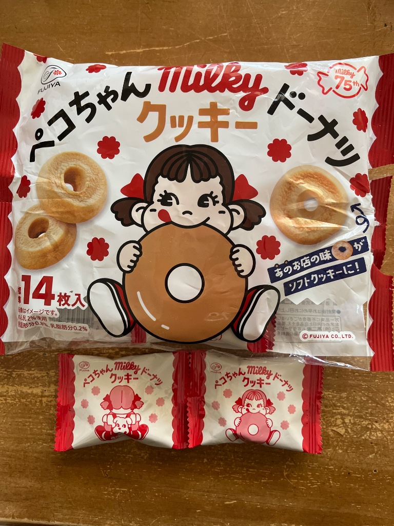 イトーヨーカ堂で買った「不二家 ペコちゃんミルキードーナツクッキー 袋168g」。