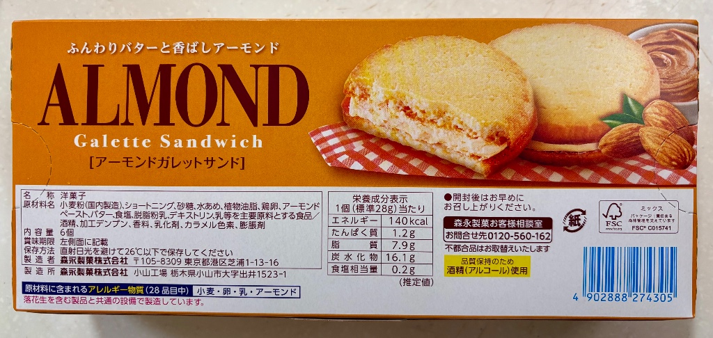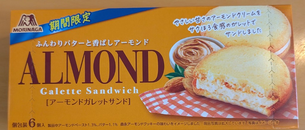 森永製菓 アーモンドガレットサンド。気になっていたこの新商品。約230円と安くなっていたので、購入しました。
