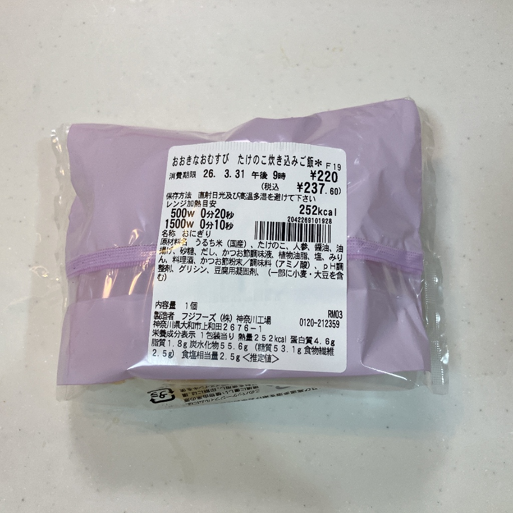 おおきなおむすび たけのこ炊き込みご飯 237円(税込)/252kcal そういえば今年 たけのこご飯食べてないなと 思っていた所のお値引き品だったので... 続きを読む