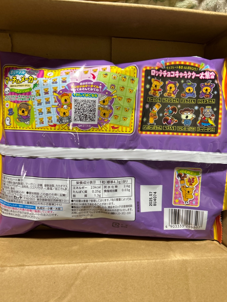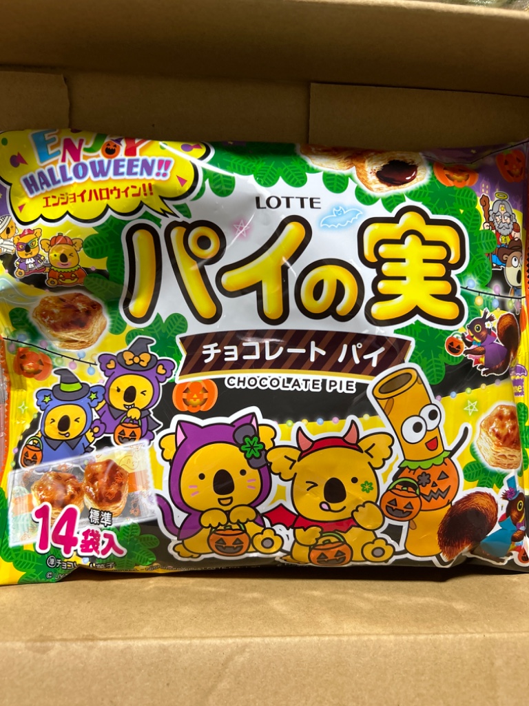コアラや、ロッテのお菓子のキャラクター トッポや、ビックリマン?たちが仮装パーティーをしているデザインでした パイの実はいつもと変わらずパイがサクサクしていてチョコレートと相性◎ 久しぶりにパイの実食べましたが美味しかったです 季節ごとにパッケージも変わるのを発見するのも楽しいですね