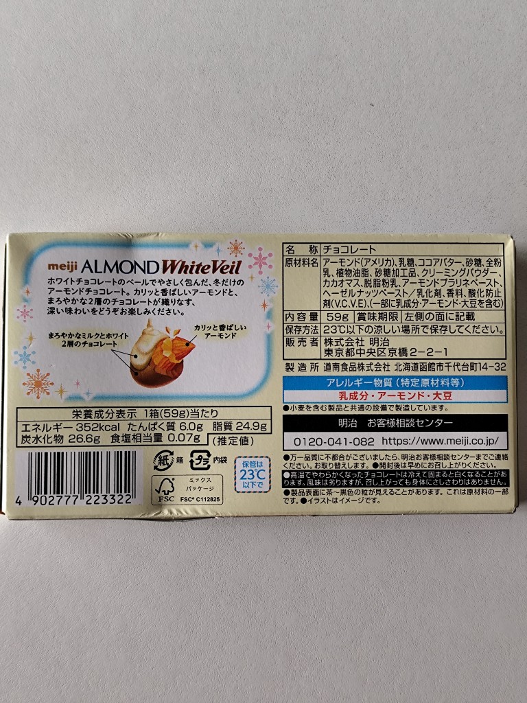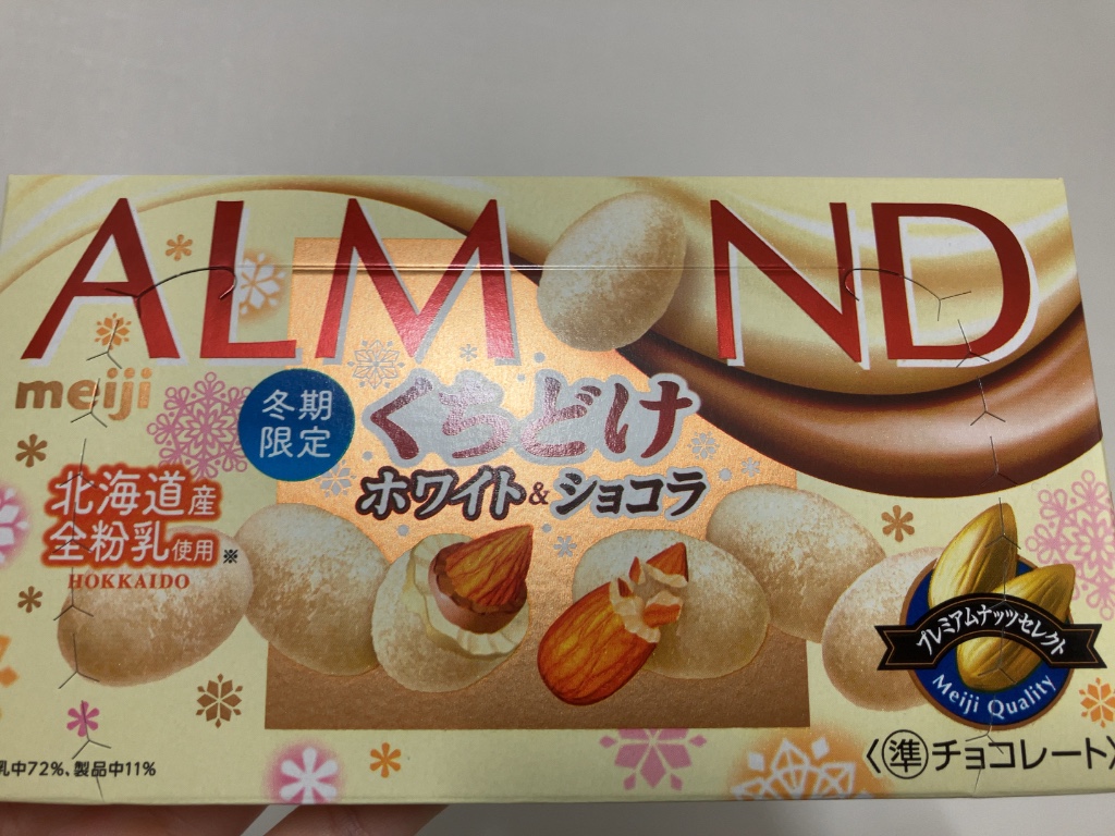 冬季限定のホワイトアーモンドチョコでした。今月賞味期限です。