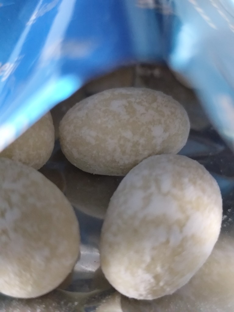 冬季限定らしいホワイトチョコレートに包まれたアーモンドチョコレート。アーモンドはカリッとして美味しいです。