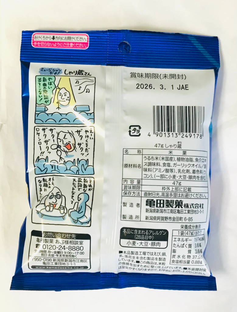 食感はザクザクしていますが一つ一つが小さいのでとても食べやすいです(^^)一度食べ始めると手が止まりません。パッケージ後ろには『しゃり蔵さん』の3コママンガついていて食べながらほっこりしました(*^^*)... 続きを読む