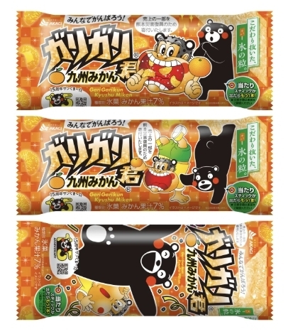 「みかんアイスの中にガリガリッとした食感が特徴のみかんかき氷を入れたアイスキャンディーです。従来品よりもかき氷部のシロップを濃く、混合する氷の量を増やすことで、甘さと後味の爽やかさをより引き立てる仕様にリニューアル。6年目となる今年も、くまモンとガリガリ君が一緒に登場です。