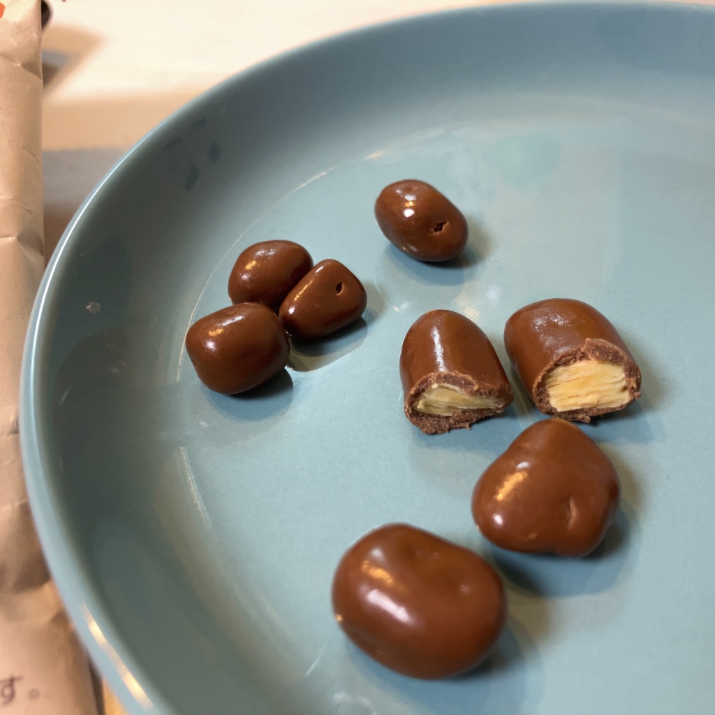コーティングチョコはビターなLAWSONのより薄め甘いミルクチョコ。