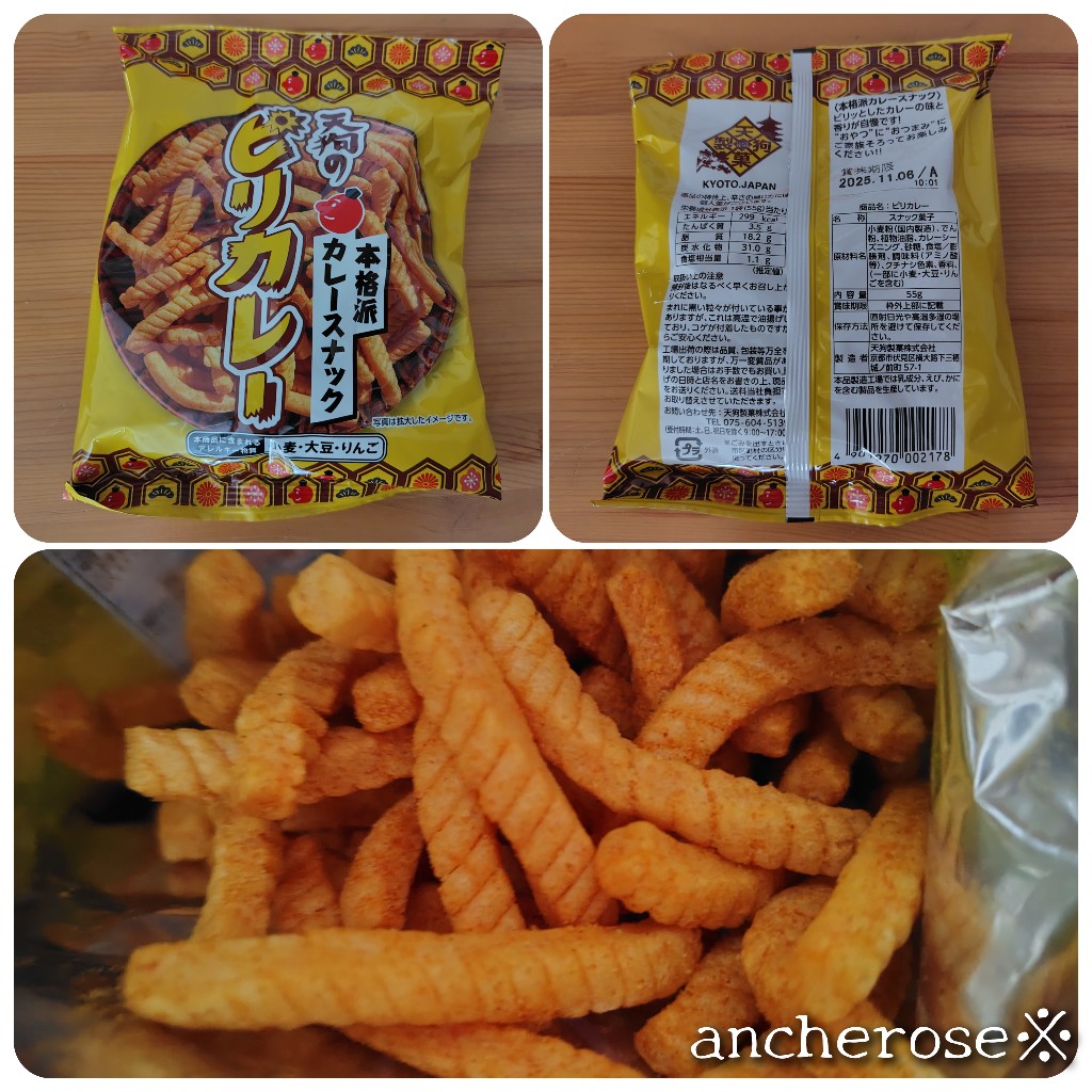 かっぱえびせん風のスナック菓子に、カレーパウダーがこれでもか!っていうくらいかかっているので、油断してたくさん口に含むと…火を吹くんじゃないかと思うくらい、辛さが口の中に広がります(苦笑)