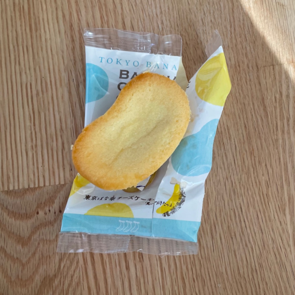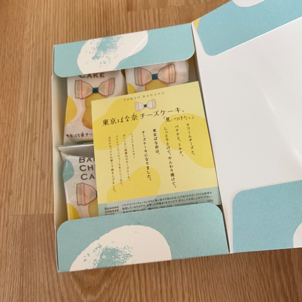 空色の可愛いパッケージをあけると、東京バナナの形をした小さなチーズケーキ!袋をあけると、チーズの香りがします。食べてみ、チーズが濃厚!上はチーズケーキ、下にはバナナピューレが入っているので、東京バナナの馴染みある味を楽しめます。口説くない甘さなので、何個でも食べられます。