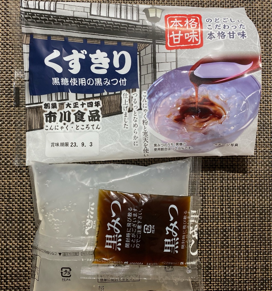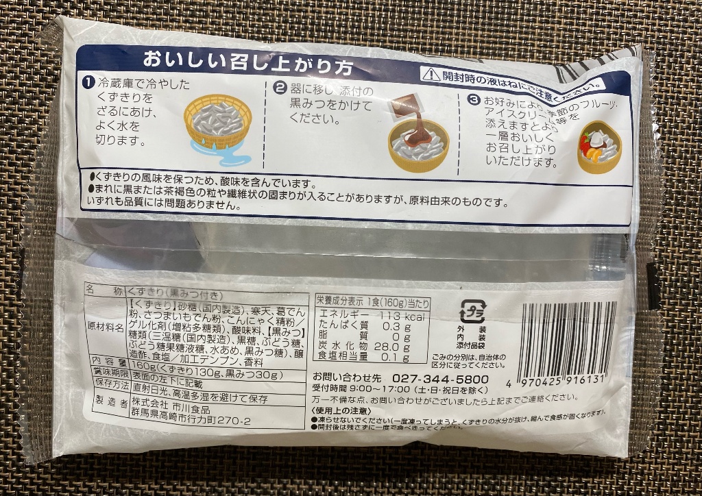 内容量は160g(くずきり130g、黒みつ30g)で1食当たり113カロリー。