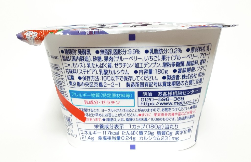 明治さんから発売されています、ブルガリアヨーグルト 脂肪ゼロ ブルーベリー&3種のベリー180g。