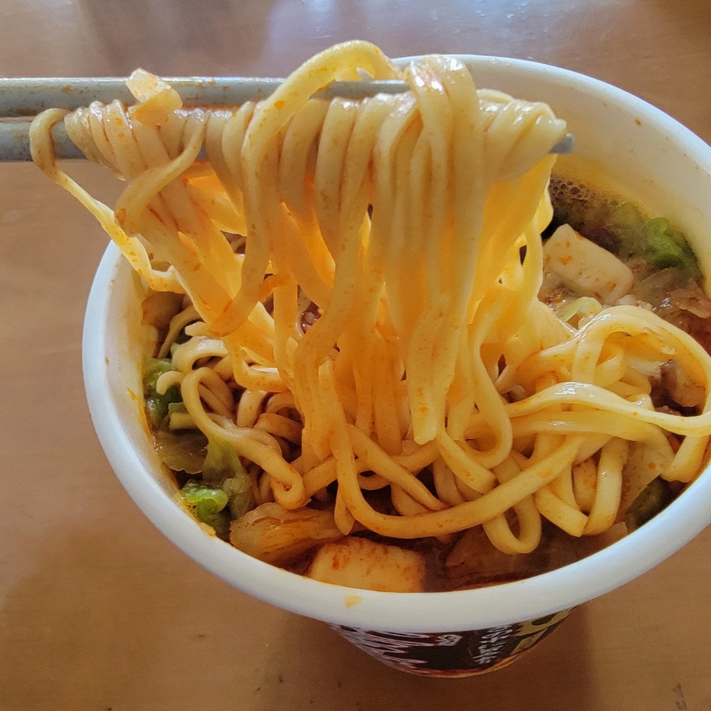 あと麺も好き!平べったいけど噛みごたえがあって、他のカップ麺にはないタイプの麺です。とろみのあるスープとよく絡んでめっちゃ美味しいです。