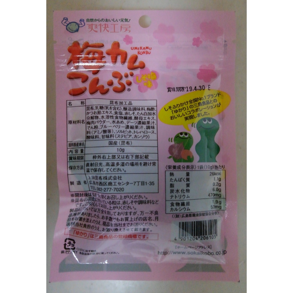「カルくカムこんぶ」の姉妹品で、国内産の昆布にしそ、梅酢で爽やかな味付けをした商品です。味のベースとなる「しそ」は、国内産のしそのみで作られた三島食品株式会社の「ゆかり」を使用しています。砂糖は使用しておりません。「カルくカムこんぶ」同様、お手軽に食べられる小さなチャックつきのパッケージです。